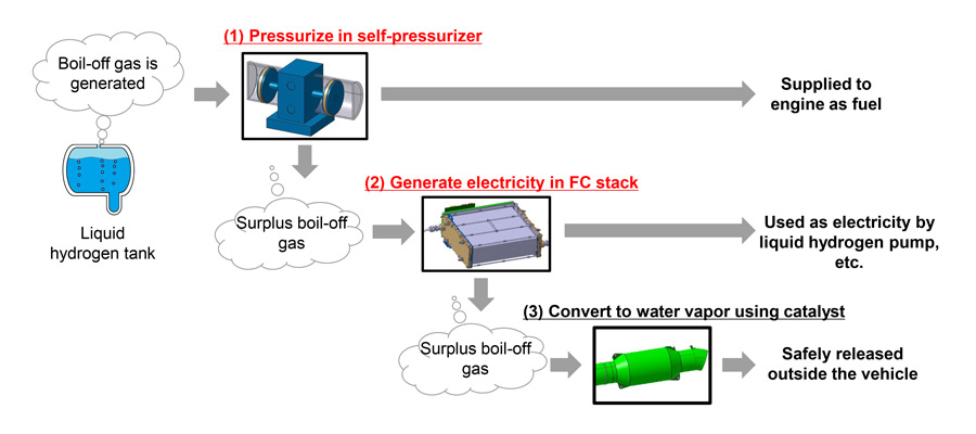 所产生的电力可用于为液氢泵的电机等部件供电。如果实现的话,这将有可能利用蒸发气体来补充电力(相当于小型交流发电机的发电量),从而提高能源效率。