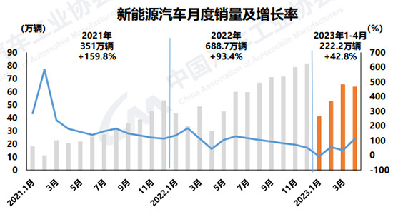 相比车市整体,新能源汽车依旧保持快速增长趋势。数据显示,4月,新能源汽车产销分别完成64万辆和 63.6万辆,同比均增长1.1倍,市场占有率达到29.5%;1-4月,产销分别完成229.1万辆和222.2万辆,同比均增长42.8%,市场占有率达到27%。
