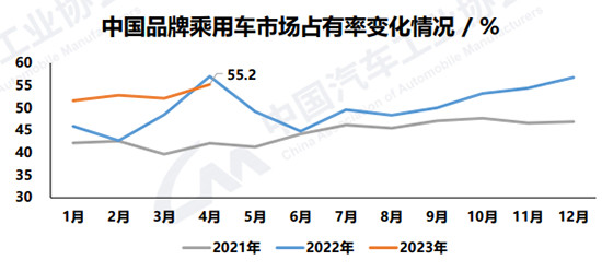 在乘用车市场整体恢复增长的大背景下,中国品牌乘用车市场份额也趋于稳定。4月,中国品牌乘用车共销售99.9万辆,同比增长81.4%,占乘用车销售总量的55.2%,比上年同期下降1.9个百分点。