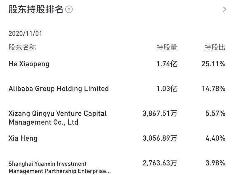 从招股说明书中可以看到,小鹏汽车的股东数量众多。小鹏汽车董事长、CEO何小鹏是公司的最大股东,持股31.6%,再加上公司创始人总裁夏珩、副董事长兼总裁顾宏地、高级副总裁何涛等持有的股份,小鹏汽车管理层共持股40.9%。阿里则是最大的外部股东,持股14.4%,其他主要股东还包括IDG、小米、GGV纪源资本、晨兴资本等。