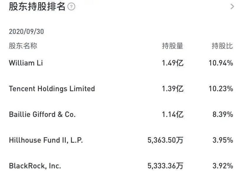 2年来,蔚来的股东结构发生了不少变化。据老虎证券数据显示,李斌目前持股10.94%,腾讯持股10.23%,比例均有所下降,新增的Baillie Gifford & Co持股8.39%。同时,高瓴资本持股3.95%,大幅缩减。今年三季度,高瓴买入蔚来241.2万股,持有市值为5117.7万美元。