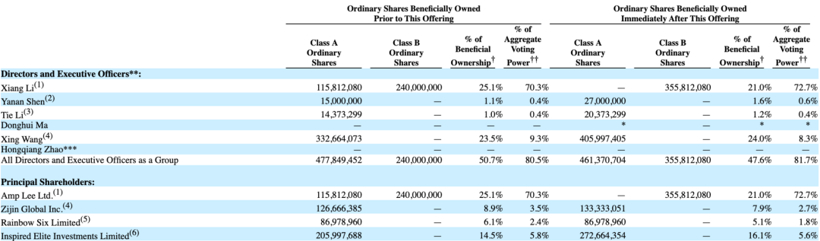 其招股书称,含李斌在内约17位高管集体拥有21.1%股份,其中李斌持股17.2%,蔚来北美CEO Padmasree Warrior、理想汽车创始人李想分别持股1.4%和1.7%,两人是高管层除李斌外仅有的持股占比超1%的股东。除此之外,腾讯持股15.2%、高瓴资本持股7.5%,同李斌的实际关联公司Founder vehicles并列三大核心法人股东。