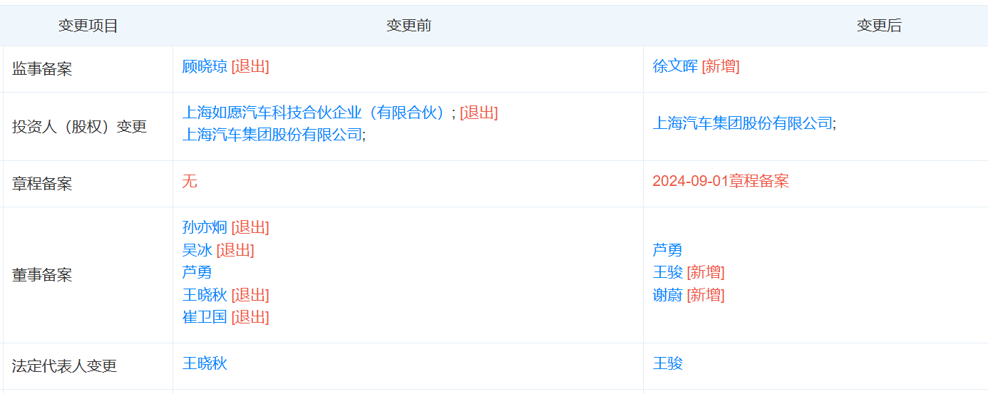 天眼查显示,近日,飞凡汽车科技有限公司发生工商变更,原股东上海如愿汽车科技合伙企业(有限合伙)退出,王晓秋卸任法定代表人、董事长,由王骏接任,同时,公司多位主要人员均发生变更。