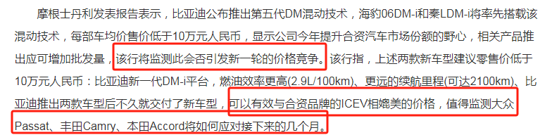 较为权威的声音来自国际金融服务公司摩根士丹利,从其发布的公告来看,至少可以提炼两个点;一,大摩对DM 5.0的认可,其次,搭载DM 5.0的秦L与海豹06 DM-i的上市使其对合资汽车的处境担忧,甚至特别强调了将监测大众Passat、丰田Camry、本田Accord将如何应对接下来的几个月。