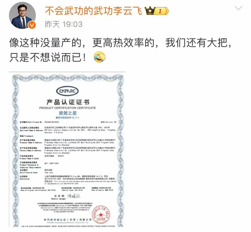 面对发难,比亚迪李云飞分别在当日下午3点多与7点多两次回应,一是强调量产,二是公布了一张发动机热效率46.5%能效认证的证书,并表示没有量产的,比亚迪有大把。