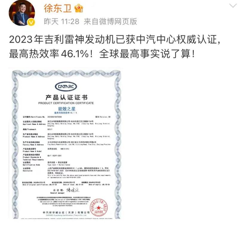 5月29日上午,吉利汽车销售公司副总经理徐东卫发布了一份中汽中心的认证证书,并配文“全球最高事实说了算”。46.1%的发动机热效率认证,直指前一晚比亚迪发布第五代DM技术时提到的发动机热效率达到了46.06%,全球第一。