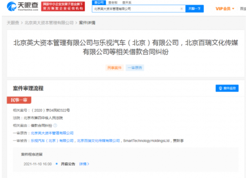 贾跃亭和乐视汽车遭国家电网子公司起诉 06月05日19时53分19秒, 2025 人气: 729 来源:车域星图 财经网汽车讯 10月13日,天眼查App显示,近期,贾跃亭、乐视汽车(北京)有限公司等因借款合同纠纷被北京英大资本管理有限公司(国家电网有限公司全资子公司)起诉,相关案号(2020)京04民初322号,该案将于11月10日在北京市第四中级人民法院开庭审理。 上一篇: 2023泰达论坛|王远力:抢占技术制高点,始终保持核心竞争力 下一篇:独家|离开天际汽车,向东平下一站北京现代