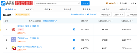 在收购济南富能半导体后,比亚迪成立了济南比亚迪半导体有限公司(以下简称“济南半导体”),注册资本为49亿元,比亚迪半导体董事兼总经理陈刚为济南半导体法定代表人。另外,企查查上济南半导体的股权结构显示,比亚迪半导体认缴38.1亿元、持有77.75%股权,即济南半导体并非比亚迪的全资子公司。