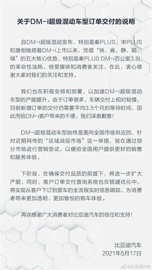 除了业务的拓展,比亚迪的这次收购同样有着有着扩充产能的考量。毕竟,比亚迪产能不足的问题困扰已久。今年上半年,比亚迪DM-i车型订单突破10万辆,许多订户等待数月仍然提车不成,以至于比亚迪官方在5月17日出面回应,DM-i车型新增订单的交付仍需要平均3.5个月的等待时间。